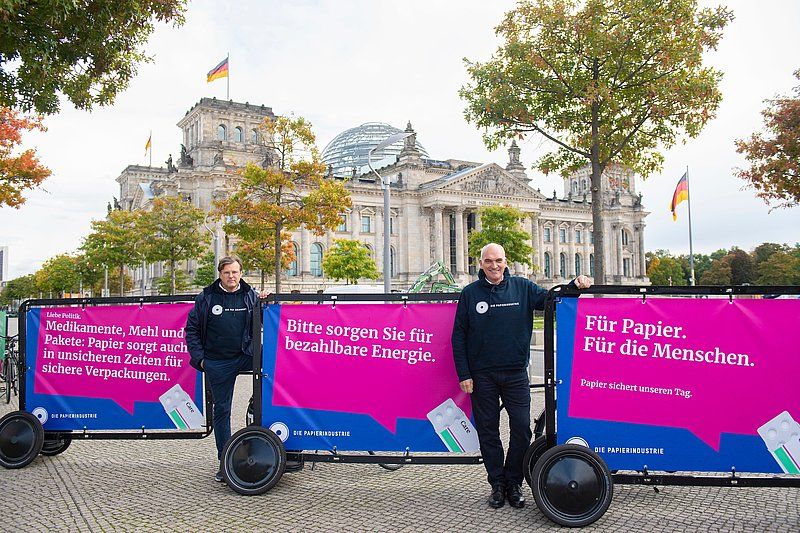 DIE PAPIERINDUSTRIE hat ein Konzept für eine neue Energiepolitik vorgestellt und in Berlin demonstriert. Präsident Winfried Schaur (r.) und HGF Alexander von Reibnitz präsentierten die Forderungen.